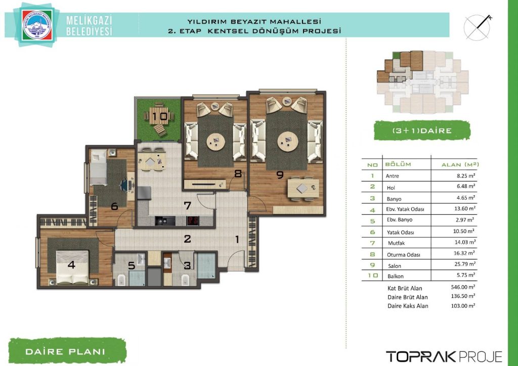 Toplam 136,50 m² brüt alana sahip olan dairede; geniş ve ferah 25,79 m²’lik salon, 16,32 m² oturma odası,