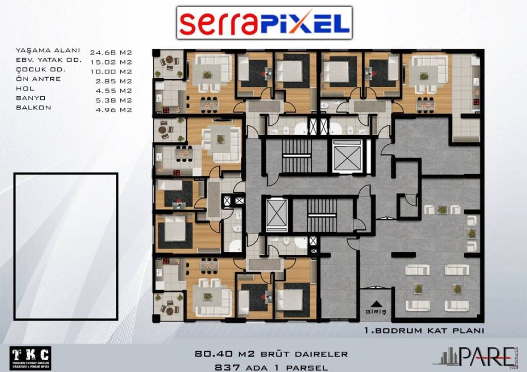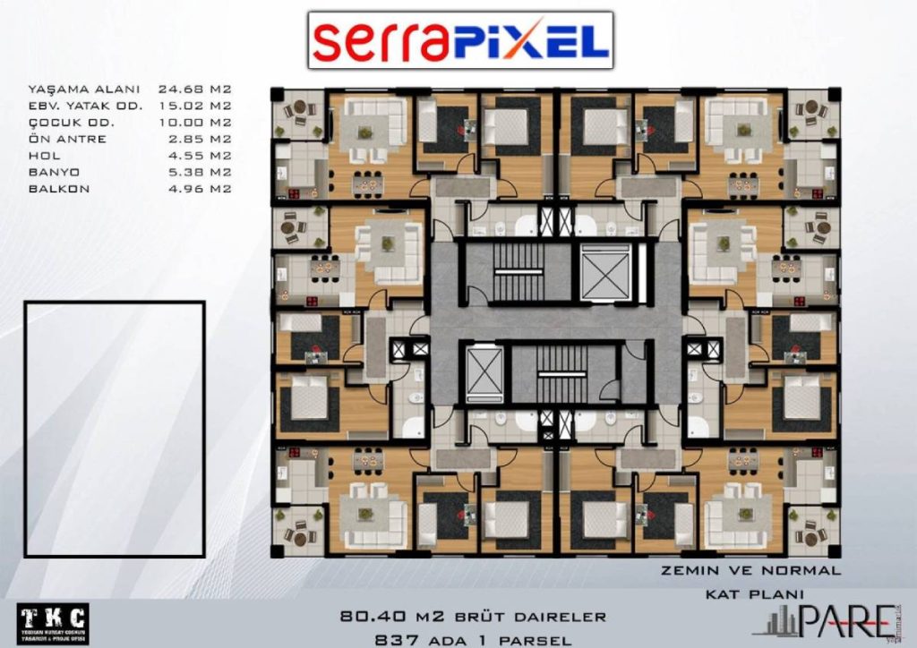 Modern yaşamın konforunu ve estetiğini bir arada sunan SerraPixel Konut Projesi, ferah yaşam alanları ve işlevsel tasarımıyla öne çıkıyor. Zemin ve normal katlarda yer alan 80,40 m² brüt daireler, her detayı düşünülerek planlandı.